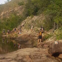After a moderate to difficult hike we found this beautiful place. Swam out to the falls. The water was warm, but the falls water was very cold.