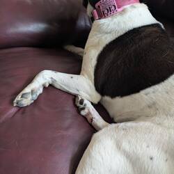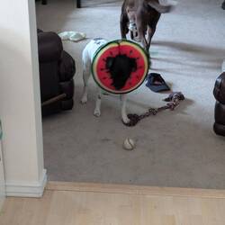 Cici's bandage is off but collar on alternating with putting a bandage on.