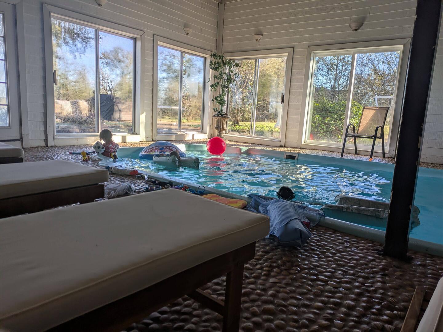 We rented a large VRBO home. The little ones are doing a after breakfast swim. We had nasty weather yesterday evening but the indoor pool was a great way to spend the evening.