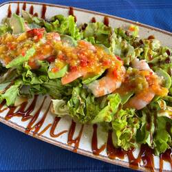 About ten miles in, we stopped for lunch at a last ditch place on a very busy street, very tired and hot. The owner took us through the building to a patio in the back that was a total oasis of shade and quiet and served us a great shrimp and avocado salad. Today was a complete win for food!