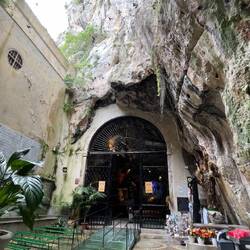 Nach einer sagenhaften Auffahrt kam dann ein Highlight - die Kirche "Santuario di Santa Rosalia" wurde in eine Höhle gebaut. Besser gesagt, die vor die Höhle wurde eine WallfahrtskircheLue lisää