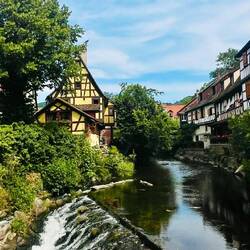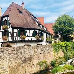 Herausgeputzte Fachwerkhäuser, Blumen vor dem Haus, ein Bächle mitten in der Ortschaft.