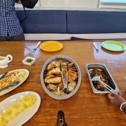Da wir um 09.00 Uhr im Hafen sein sollen waren wir schon um 07.45 Uhr frühstücken. Wir waren überrascht aber das Personal hat, um allen Diskussionen aus dem Weg zu gehen ein Tisch für 7 PersonenBaca selengkapnya