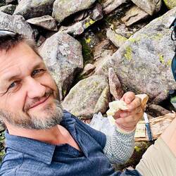 12:24 Uhr: Jetzt habe ich eine schöne Mittagspause gemacht – naja, eigentlich ist es mein zweites Frühstück. Und damit der Abstieg auch gleich schön klappt, habe ich als Nachtisch noch eine Ibuprofen eingeworfen.