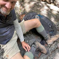 Bei den Socken habe ich mich für lange CEP Kompressionssocken (Max Cushion Socks Hiking Tall) entschieden. Obwohl sie relativ warm wirken, habe ich es nie als unangenehm empfunden. Vorher hatte ich einmal Kompressionssocken in dunkelblau ausprobiert und da fand ich, dass sie bei Sonneneinstrahlung schon sehr warm waren. Das grau-grün war neutral.