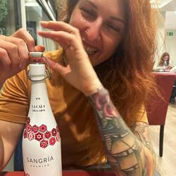 Zum Abendessen kehren wir dann beim Italiener ein. Der ist ganz entzückt von Zisis Französisch und macht uns direkt zu seinen 👑-Kunden. Er will uns auch jeden Wunsch erfüllen. Er empfiehlt uns den „besten Sangria“, den es gibt. Er mache unser einen guten Preis, wenn wir die Flasche nehmen. Aber wir dürfen auch nur ein Glas haben, wenn wir möchten. Vorsorglich stellt er die exklusive Flasche Nr. 19 schon mal hin. Und oh Wunder, die schmeckt wirklich ✨😋😋😋
