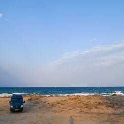 Jetzt ging es direkt zum nächsten Strand mit potentiellem Stellplatz. In Bulgarien ist freies Campen grundsätzlich verboten. Als wir am Strand ankamen, stand dort gleich ein Polizeifahrzeug und direkt daneben haben ca. 15 junge Leute "ihr Lager" geräumt. Polizisten waren nicht zu sehen. Wir haben uns erstmal auf einen Parkplatz gestellt und die Lage beobachtet. Die "Lagerräumung" hatte aber wohl nichts mit der Polizei zu tun, sondern eher weil der Tag zu Ende ging. Tina hat dann einen Windsurfer gefragt wie das mit campen am Strand ist und der meinte nur: "no Problem". Also sind wir den sandigen Weg am Strand entlang gefahren und haben uns ein Plätzchen in den Dünen gesucht.