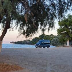 Heute war Euböa auf relativ langer Strecke sehr schön mit Küstenstraße und so. Dann Straßensperrung wegen Radrennen und unklare Umleitung durch die Stadt und RICHTIG engen Straßen, gegen Einbahnstraßen und durch gesperrte Straßen. Naja, wir sind heil durchgekommen. Haben dann in einem Restaurant am Straßenrand mit verschiedenen Familienfesten, gemeinsam, Schwein vom Grill gegessen...sehr lecker.