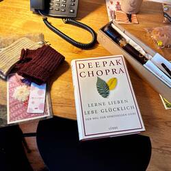 Mein Zimmer im Teufelhof war noch nicht fertig, aber ich konnte mich bereits anmelden, die Basel Card in Empfang nehmen und meinen Koffer dagelassen. Welch ein Glück: heute ist hier in Basel Herbstmarkt. Das bedeutet viele stände mit Essen und handwerklichen schönen Dingen. Natürlich bin ich fündig geworden. Handgemachte Stulpen aus Alpaka Wolle, hand,genähte Lederschuhe aus Anatolien (damit wird das Ering im Garten gut klappen), ein Mini Sax als neues Musikinstrument, Pfefferkuchen zum naschen und einen wunderbaren Duft von der Bergtanne. Eine schöne Atmosphäre, sonniges, warmes Wetter und lauter nette Menschen. Ich liebe Basel!. Gegen eins war ich dann essen beim Italiener. Das wurde aber auch Zeit. Auf dem Rückweg lag an einem Tröde- und Antiquariatladen ein Buch von Deepak Chopra draußen. Für fünf Franken habe ich es erstanden 😍.