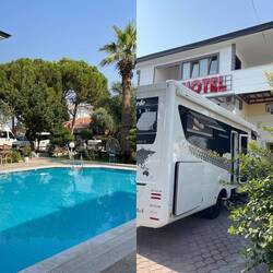 Wir finden einen coolen Stellplatz auf dem Hotelparkplatz bei Suleyman. Der Chef steht vor seinem Hotel auf der Straße, sieht, dass wir uns umschauen und bietet uns den Parkplatz an, inclusive WLAN, Benutzung des Swimmingpools und ein türkisches Frühstück zu einem guten Preis.