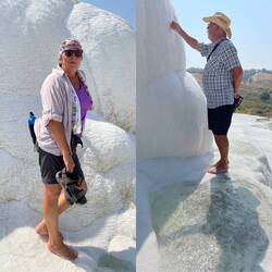 Gestärkt vom türkischen Frühstück machen wir uns den kurzen Weg vom Hotel auf und erklimmen den weißen Hügel. Wir müssen die Schuhe ausziehen, das warme Thermalwasser läuft wohltuend durch die Zehen. Mit uns hunderte Touristen aus aller Welt.