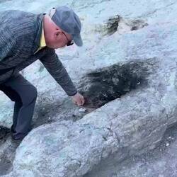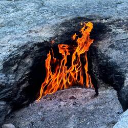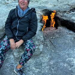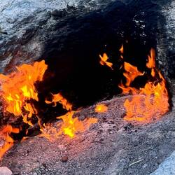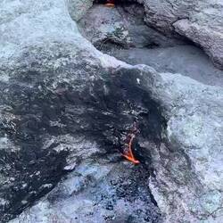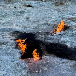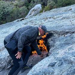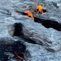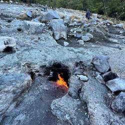 Es brennen nur wenige Feuer in den Felsspalten, der Wind bläst manche aus. Mein „Feuermännchen“ hat einige wieder zum Brennen gebracht. Dieter freut sich, dass er mit einem Stück Holz den „Berg anzünden kann“.