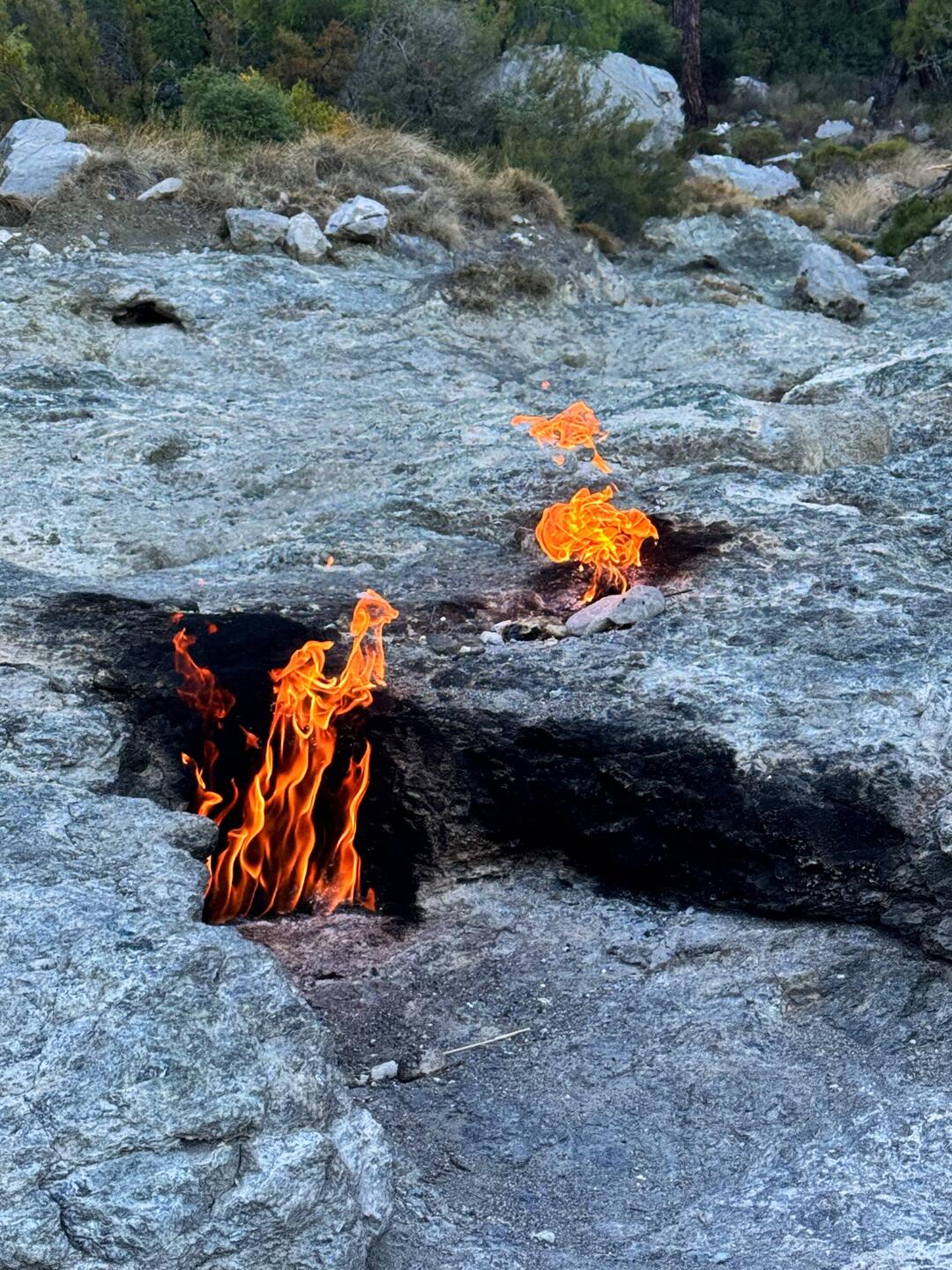 Hier auf dem Berg, in der Olympos Region, bedrohte das Mischwesen Mensch und Tier; dort treten seit Urzeiten als seltenes Naturphänomen Gase aus, die sich entzündet haben bzw. die man anzünden kann. Die „ ewigen Feuer der feuerspeienden Chimaira“.