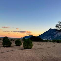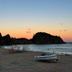 In der letzten Nacht hat es ordentlich geblasen. Wir fahren vom Strand weg an eine geschützte Stelle zwischen den leeren Ferienwohnungen. Das Ergebnis heute Morgen war phantastisch. Der Wind hat alle Wolken weggeblasen und die Taurusberge zeigen sich in aller Pracht. Insbesondere der Tahtali Dagi, was übersetzt „Der Hölzerne“ bedeutet, zeigt sich von seiner besten Seite. Er ist mit seinen 2366 m der höchste Gipfel der Ausläufer des Taurusgebirges, der der Küste am nächsten kommt. Die Seilbahnstation ist deutlich zu erkennen. Dieser klare, blaue Himmel, die wolkenfreien Berge und der nächste schöne Sandstrand lassen uns die zeitweise heftige Schaukelei in der Nacht schnell vergessen.