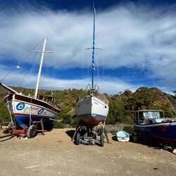 Die Holzboote, mit denen in der Saison die Touristen übers Meer geschippert werden, liegen auf dem Strand „geparkt“.