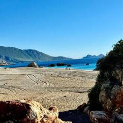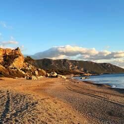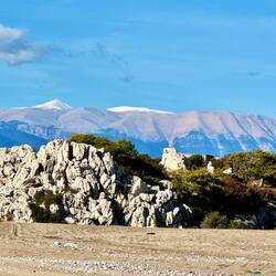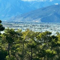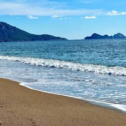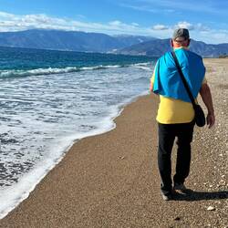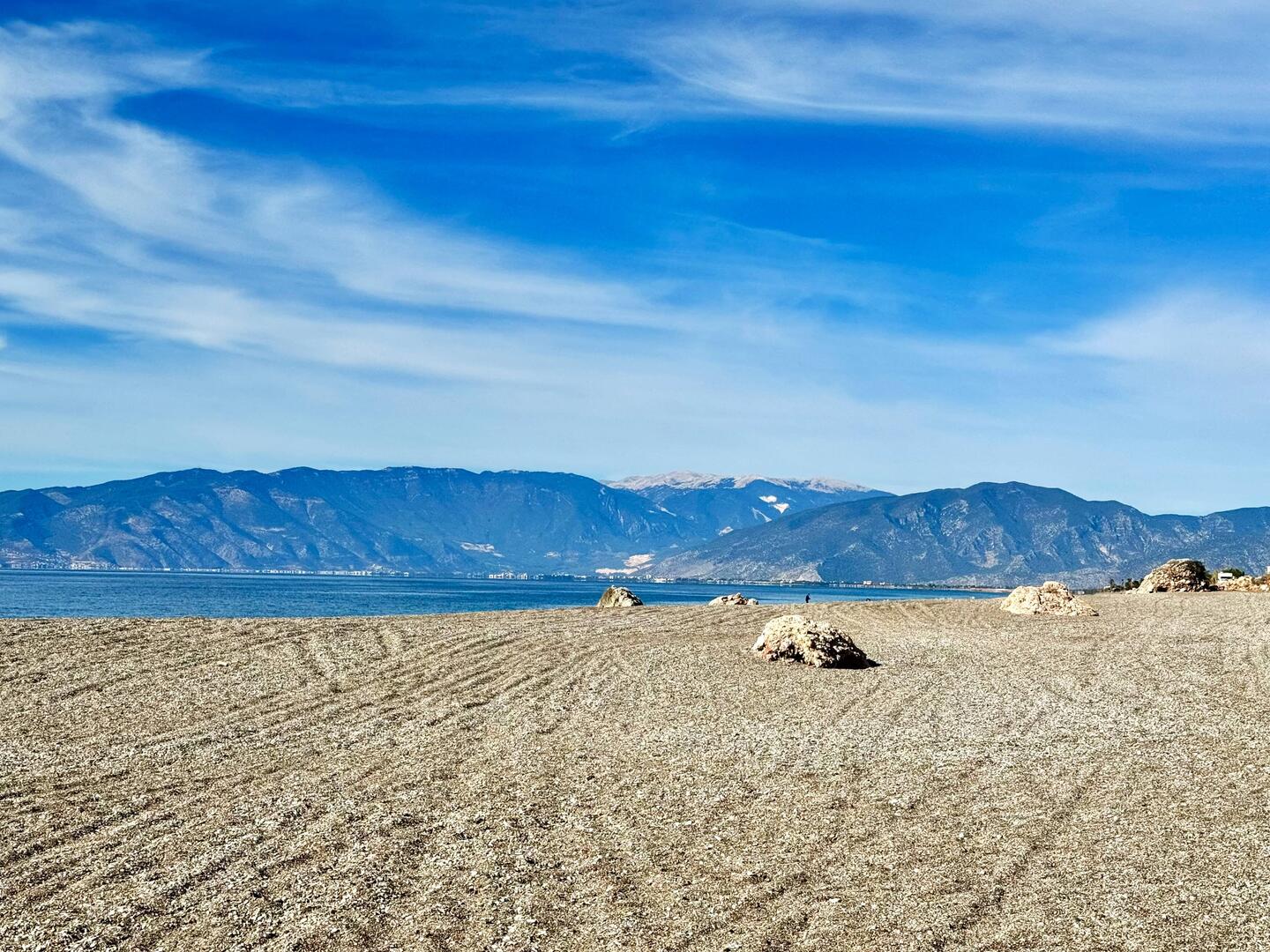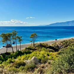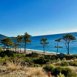 Wir juckeln gemütlich über die Landstraße vorbei am Bergmassiv des Olympos an den nächsten Strand. In der Nacht hat es geschneit, einige Taurusgipfel tragen weiße Hauben.