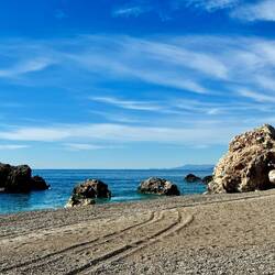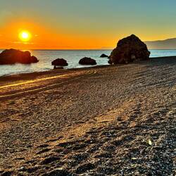 Es gibt hier alles am Strand. Wasser, Toiletten, Duschen unter freiem Himmel. Aber auch jede Menge Gewächshäuser im Ort und Hinterland. Der Anblick bei der Herfahrt erinnert uns sofort an die südspanische Küste bei Balerma.