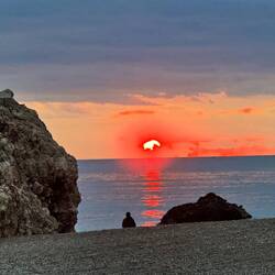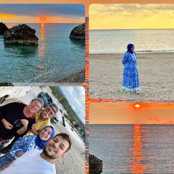 An unserem Übernachtungsplatz am Strand lernen wir ein türkisches Ehepaar kennen. Sie kamen zum Sonnenuntergang und hatten sich im Sand festgefahren. Dieter hilft mit Spaten und Manneskraft. Sie bedanken sich tausendmal und es gibt ein Erinnerungsfoto! Der magische Sonnenuntergang entschädigt für alle Mühen.Læs mere