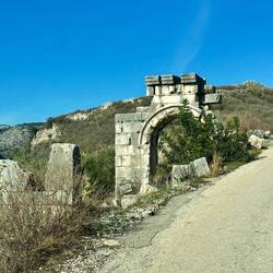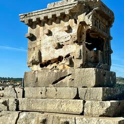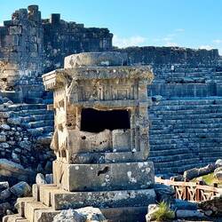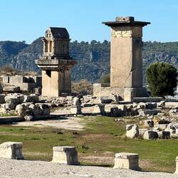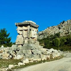 Immer wieder sieht man auf der weiteren Strecke Richtung Fethiye in die Felsen am Berg geschlagene, lykische Gräberportale und spitzgiebelige kleine Häuser, die ebenfalls in grauer Vorzeit fürLäs mer