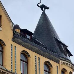 Das gelbe Katzenhaus, im Stil einer mittelalterlichen Burg erbaut, leuchtet an der nächsten Ecke. Gut zu erkennen an beiden Katzenskulpturen auf den Giebeln. Es wurde 1909 erbaut.