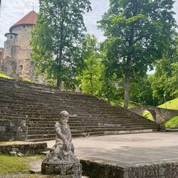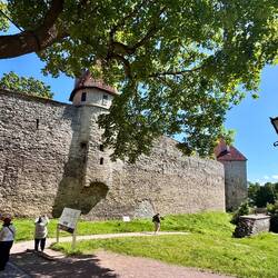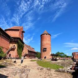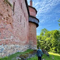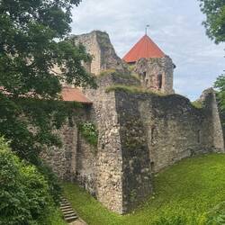 Wir parken am Seerosenteich und laufen durch die gepflegte Gartenanlage mit alten Häusern und dokumentierten Geschichten über das frühere Leben der Ureinwohner, der Liven, zur Burganlage. Vom hohen Turm aus hat man einen guten Weitblick bis hinunter ins Flusstal der Gauja.