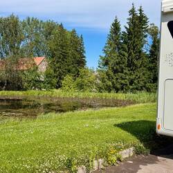 Wir übernachten nicht auf dem übergroßen Parkplatz vor dem Weihnachtsdorf, sondern fahren in das nahegelegene ausgedehnte Langlaufgebiet mit unzähligen Loipen, Wanderwegen und Sprungschanzen. Hier finden wir ein schattiges und ruhiges Plätzchen unter Bäumen.