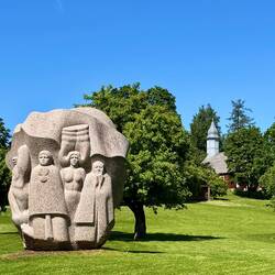 Aber nicht nur die rote Burg, sondern auch ihr Umfeld ist einen Besuch wert. Denn das Herz der Gartenanlage ist der Folk Song-Hill auf dem sich schon in den 80ziger Jahren Sängergruppen trafen. Etwas später wurde der Skulpturenpark eröffnet und es fand das erste Folklore Festival „Baltica“ statt. Die Steinskulpturen zeigen Motive aus den Dainas, den alten lettischen Volksliedern, die im besetzten Lettland ein Anker der ureigenen Kultur in der russifizierten Heimat darstellten.