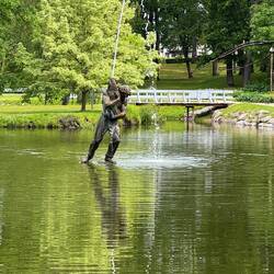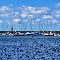 Auf der quirligen Hauptinsel ist schon mehr los. Die sympathische „Hauptstadt“ Kuressaare wartet mit einer großen Bischofsburg auf. Wir haben tolles Wetter. Es macht Spaß durch die kleinen Gassen zu laufen. Den Mittelpunkt des Städtchens bilden am Marktplatz einladende Cafés und Geschäfte. Der Yachthafen ist schön gestaltet und es gibt dort eine ausdrucksstarke Skulptur, die unsere Aufmerksamkeit erregt. Dazu gibt es wieder eine Geschichte, die auf einer Messingtafel vor dem Denkmal in Deutsch geschrieben steht: