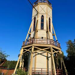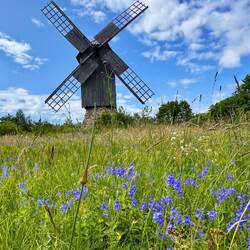 Auch die alte Bockwindmühle hinter dem Parkplatz passt malerisch ins Bild. Bockwindmühle bedeutet, dass sie aufgebockt steht und mit Stangen in den Wind gedreht werden kann.