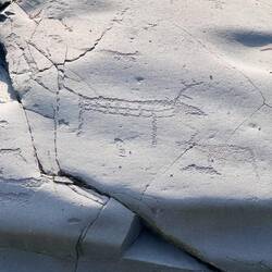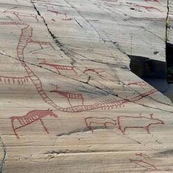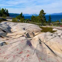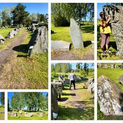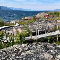 Ich laufe mit einem Begleitheft fast 5 Kilometer durch das Gelände. Manche Ritzungen sind selbsterklärend, für andere braucht man viel Phantasie. Zu sehen sind in der Hauptsache Menschen auf der Jagd, Tänze, Boote, Rentiere, Fische auch Kreise und Fruchtbarkeitssymbole. (die habe ich im Heft nachgeschaut 😉) Die Anlage ist super gepflegt und der Bohlenweg erleichtert das Wandern.