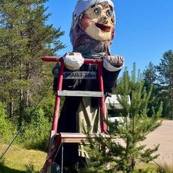 Beim Frühstück auf einem urigen Rastplatz leistet uns Martta, eine tolle Holzfigur Gesellschaft. 🤩