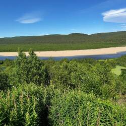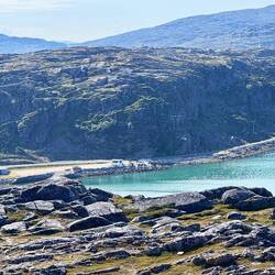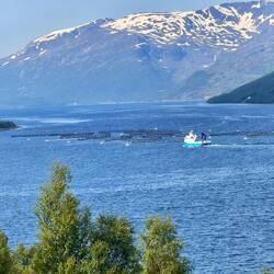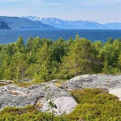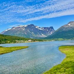 Auch jetzt ändert sich die Landschaft unmittelbar. Es wird bergige. Bald schon tauchen die ersten schneebedeckten Bergspitzen auf. Es wird rauher und auch windig. Eine Berg-und Talfahrt beginnt. Unser Ziel ist der Porsangerfjord und hier der am südlichen Zipfel gelegene Ort Lakselv. Der Fjord schneidet 120 Kilometer ins Festland ein und ist der viertlängste Norwegens. Wir stehen außerhalb des Städtches schön im Grünen mit Blick auf die Sandbänke der Fjordausläufer.