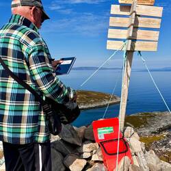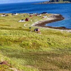 Jetzt haben wir uns aber das Wochenende verdient. Ein wunderbares Plätzchen finden wir einige Kilometer außerhalb in der Kirkegårdsbukt in Forsøl. Wir baden am kleinen Sandstrand, der über einen Bohlenweg erreichbar ist, wandern übers Fjell bis zum Gipfel tragen uns in das Gipfelbuch ein, genießen die wunderbaren Ausblicke in den Fjord, liegen im Wollgras rum und freuen uns des Lebens. Die Sonne geht nicht unter, wir könnten die ganz Nacht am Ufer sitzen.