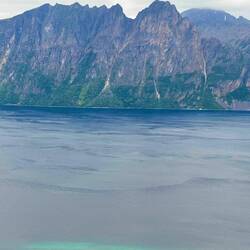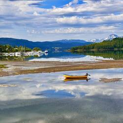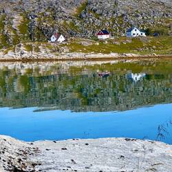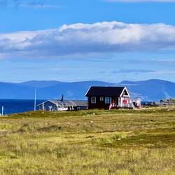 Allerdings haben wir die Fahrt bis hierher sehr genossen. Die Wolkenspiele am Himmel, das Meer in allen Blauschattierungen, die kleinen Häuser am Fjordrand.