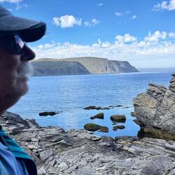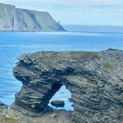 Er ist eine geologische Besonderheit: ein mehrere Meter breiter Felsvorsprung in Treppenform, der an der einen Seite eine Runde Öffnung hat. Durch sie ist die Spitze des Nordkap-Felsens gut zu sehen. Wunderbares Wollgras begleitet uns auf dem holprigen Weg. Die Anstrengung hat sich unbedingt gelohnt!