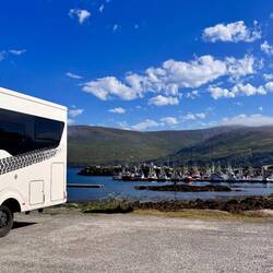 Harstad, unser erstes Ziel wartet nicht nur mit einer perfekten Entsorgungsanlage am Ortseingang auf. Da schlägt das Wohnmobilistenherz gleich höher. Harstad gilt auch als kulturelles Zentrum Nordnorwegens und hat die nördlichste Artic-University, ein modernes Glasensemble direkt im Hafen. Wir erkunden das Städtchen, freuen uns über fangfrische Garnelen direkt vom Kutter und lassen uns in einem der vielen Cafés die obligatorischen Zimtschnecken mit sehr gutem Kaffee schmecken. Der Preis ist überall gleich. Zwei Kanelboller, zwei Kaffee 20 Euro!😅