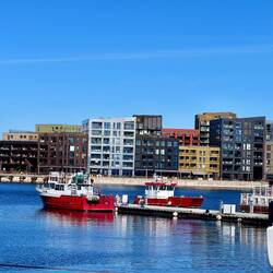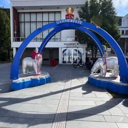 Eines der Wahrzeichen der Stadt begrüßt uns gleich am Anfang. Der riesige Eisbär! Von seinen Tatzen aus hat man einen guten Überblick über das Städtchen, das in zwei Hälften nördlich und südlich der großen Hafenbucht reicht. Im Hafen liegt das Kreuzfahrtschiff Vasco da Gama. Deren Passagiere laufen über die Holzbohlen am Hafen und schauen sich um. Genau das machen wir auch ohne wirklich etwas Besonderes zu entdecken.