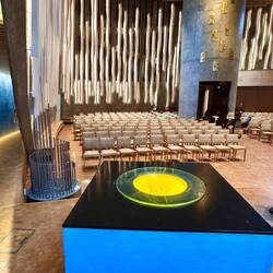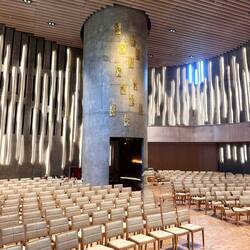 Das markante Bauwerk, das sich spiralförmig Richtung Himmel streckt, beeindruckt im Inneren mit einer dynamischen Lichtinstallation. Das Taufbecken ist aus Marmorstuck in 32 verschiedenen Blau-Tönen. Das hat uns u.a. sehr gut gefallen.