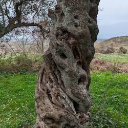 TravelerApparently it's a lime-based paint (no, not the fruit). Protects the olive trees from insects and pests (and blind people).