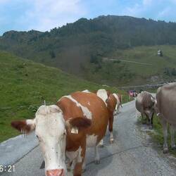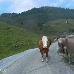 Die originären Bewohner der Alm beanspruchen die Strasse für sich.... Auge in Auge und in einer himmlischen Unaufgeregtheit sozusagen ! Nun ja, auf rund 2000 m Höhe, muss das ja auch erlaubt sein.