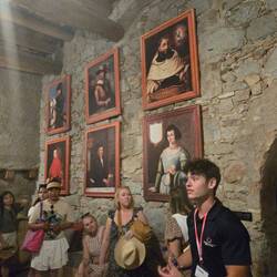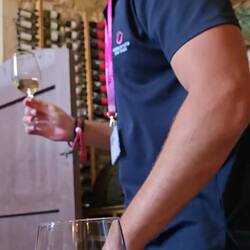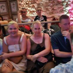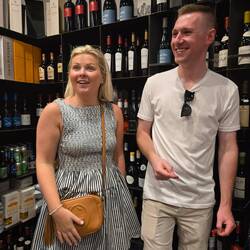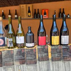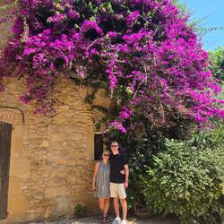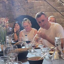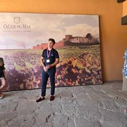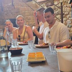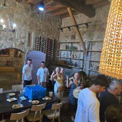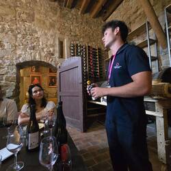 Laura did not do well on the windy drive down the mountain road. Upon arriving, poor Laura was under the weather. When Laura found out that our "cute" guide was the son of the owner of the winery, sheLæs mere