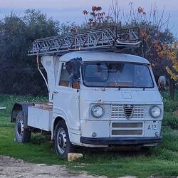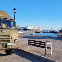 In Genua angekommen geht es schnurstracks in den Fährhafen. Kurz vor uns fährt ein etwas jüngerer Steyr LKW, dessen Fahrer Peter wir später kennenlernen. Dagegen wirkt unser Dusty richtig klein. So wie der VW T1 Bully im Vergleich zum T4 😆