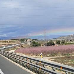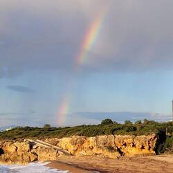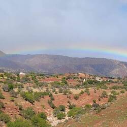 In Marrakesch schüttet es die ganze Nacht. Wir haben uns entschieden, doch noch weiter in den Süden bis nach Agadir anstatt Richtung Osten zu fahren, da die Wetterlage auf den hohen Pässen im Atlas Gebirge schlecht ist. So müssen wir anstatt bis über 2.000 Meter 'nur' bis auf über 1300 Meter durch die Berge, die im Süden die Grenze zur Sahara bilden. Auf dem Weg lässt der Regen irgendwann nach, dafür ist es auf der Höhe nur um die 3° und windig, als wir einen Stopp machen. Die rote karge Landschaft ist beeindruckend und als die Sonne rauskommt, zeigt sich hinter uns ein toller Regenbogen.