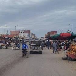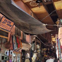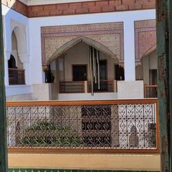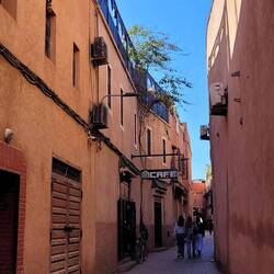 Richtung Marrakesch wird die Landschaft karger. Die Vororte wirken modern, mit Bürgersteigen und kleinen Neubaugebieten. In Marrakesch parken wir außerhalb auf einem Stellplatz. Bei dem Verkehr und wenigen Parkplätzen fahren wir besser mit dem Taxi in die Altstadt, die morgens noch angenehm leer ist. Alle Gebäude, ob alt oder neu, auch Mauern und selbst der Bahnhof sind in den traditionellen Ocker- und Rottönen gehalten, was das Stadtbild schön und ruhig aussehen lässt. Daher wird Marrakesch auch die "Rote Stadt" genannt.