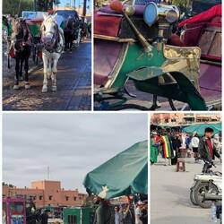 So toll die goldverzierten historischen Pferdekutschen auch aussehen, die zu hauf am Straßenrand stehen, kaum jemand fährt damit und die Pferde tun einem wirklich arg leid, die den ganzen Tag in ihrem Geschirr angespannt stehen und sich kaum bewegen können. Auch die, die durch den lauten und vollen Verkehr laufen müssen. Auf dem großen berühmten Vorplatz der Altstadt, Djmaa el-Fna, der gerade neu gepflastert wird, gibt es noch den ein oder anderen Berber, der seine Affen an der Kette für Fotos präsentiert und auch einen Schlangenbeschwörer sehen wir. Aber auch das passt nicht mehr ganz in die Zeit.