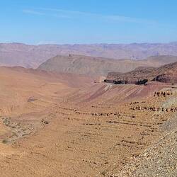 Auf dem Rückweg von einem kleinen Spaziergang in den Dünen sehen wir eine ganze Herde Kamele hinter unserem Fahrzeug vorbeilaufen. Einmal mehr eine nette Überraschung. Ganz gemütlich trotten sie in die Dünen hinein. Eines frisst in meiner Nähe in aller Seelenruhe noch etwas Gras. Später kommt sogar noch eine zweite Herde, bevor es für uns über die Piste zurück auf die Landstraße geht. Hier fahren wir noch an einem Streckenposten einer Rallye vorbei und machen Halt, damit zwei Rennwagen passieren können. Langweilig wird es unterwegs irgendwie nie. Spontan legen wir einen letzten Stopp ein, denn hier hat man einen tollen Blick auf das Ende des Ziz Valley. Diese inmitten der Wüste gelegene Oase wird vom Fluss Wadi Ziz durchflossen. Mit einer Fläche von 77.000 km² beherbergt die Region Tafilalet die größte Oase der Welt.Read more