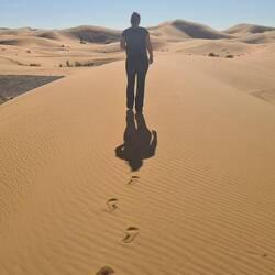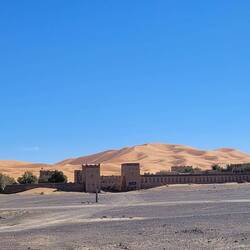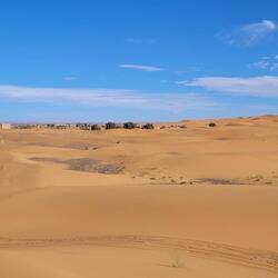 Von hier aus geht es weiter nach Merzouga. Ein kleines, im Südosten gelegenes Wüstendorf, das als Zugangstor zu den beeindruckenden Erg Chebbi-Dünen gilt. Nun sind wir in der marokkanischen Sahara. Im Dorf angekommen kaufen wir ein paar Lebensmittel ein und werden prompt von einem Guide angesprochen, der uns einen guten Tipp gibt, wo wir die Nacht ruhig stehen können. Die Sanddünen sind hier teilweise bis zu 150 Meter hoch und sehen von Weitem wie rotgelb leuchtende Berge aus. Zunächst fahren wir noch zu dem nahegelegenen See, Dayet Sri, der sich nur im Winter nach starken Regenfällen bildet. Hier sollen sich Flamingos eingefunden haben, die wir von Weitem erspähen können.