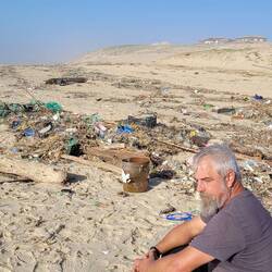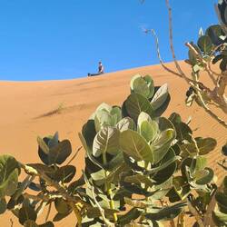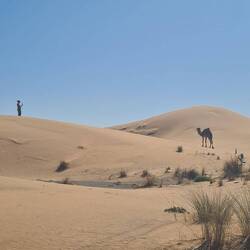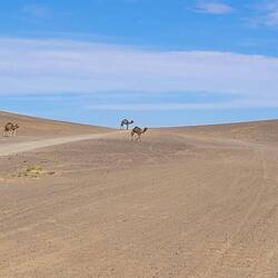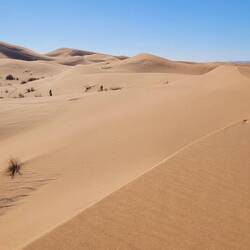 Abends parken wir dann am Rande der Dünen, hören noch die letzten Quads fahren, bis es auch hier ganz still wird. Während der Sand bei Sonnenuntergang richtig rot glüht, wirkt er morgens fast weiß. Davor die graue karge Landschaft als Kontrast.