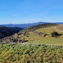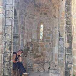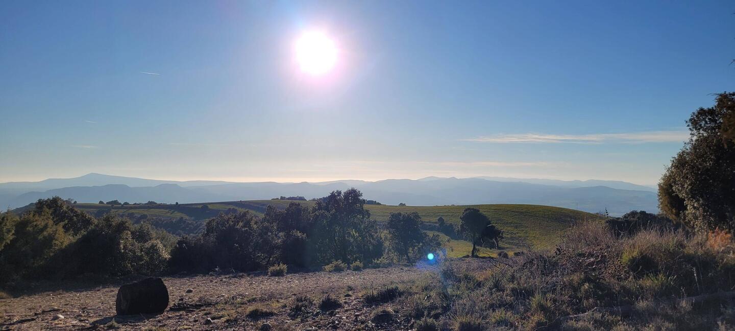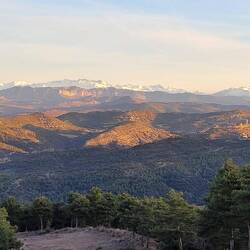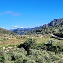 Rob hat Bilder von den Fels-Mauern von Finestras gesehen und möchte unbedingt dorthin. Dafür geht es einige Kilometer über eine Offroadpiste. Unser Navi zeigt mal wieder einen völlig anderen Weg an als den, den wir zuvor über Googlemaps recherchiert haben. In einem kleinen Dorf geht plötzlich ein schmaler eingemauerter Weg ab. Immerhin passen wir hier durch. Der Weg wird immer unwegsamer, hat immer größere Rillen, führt durch einen kleinen Fluss und Hügel hinauf. Ich bin wie immer in solchen Situationen angespannt, Rob dafür in seinem Element. "Endlich mal wieder eine richtige Offroad-Piste". Zumindest hat er genug Erfahrung und Ruhe und unser Dusty arbeitet sich Stück für Stück vor. Da es schon nachmittags ist, wir waren vorher wie gehabt noch einkaufen und tanken, schaffen wir bei knapp 5kmh gerade mal 2 1/2 Kilometer. Wir sind auf einer kleinen Lichtung angekommen und entscheiden hier zu übernachten. Auf der einen Seite der Blick Richtung Sonne und Tälern, auf der anderen Seite sehen wir die schneebedeckten Gipfel der Pyrenäen. Richtig toll.