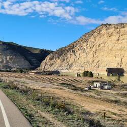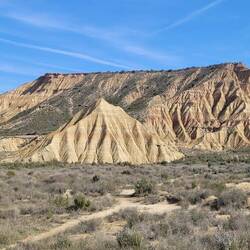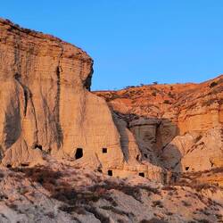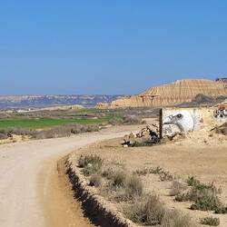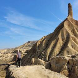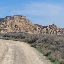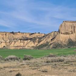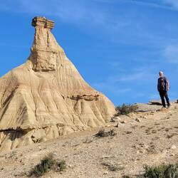 Von hier geht es am nächsten Tag an Huescas vorbei bis nach Arguedas. Nachdem wir in El Grado fast alleine standen, erwischen wir hier so eben noch einen freien Platz auf dem Stellplatz direkt vor einer tollen Felsformation mit Höhlenwohnungen, die bis in die 1960er Jahre noch bewohnt waren. Arguedas liegt im Süden der Region Navarra im Ebro-Tal in der Nähe des Nationalparks Bardenas Reales. Eine Halbwüste, in die wir am nächsten Tag fahren wollen. Hier erinnert eine Welt aus ockerfarbenem Lehm, Sandstein und Kalk sowie skurrilen Gesteinsformationen und von Trockenheit aufgeplatztem Boden an Landschaften im Südwesten der USA, uns aber vorallem auch an Kappadokien in der Türkei. Auch hier haben über Millionen von Jahren Wind, Wasser und Sonne eine Landschaft aus Tafelbergen, skurrilen Steinformationen und Schluchten mit trockenen Flussbetten geschaffen. Die berühmteste Felsformation und das Wahrzeichen des Parks ist Cabezo de Castildetierra, ein durch Erosion isolierter spitz zulaufender Berg mit einer härteren Gesteinsschicht ganz oben. Seit dem Jahr 2000 gilt die Wüste als Unesco-Biosphärenreservat.